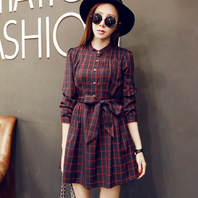 2015秋冬新款韓版淑女風長袖立領(lǐng)蝴蝶結(jié)腰帶格子連衣裙 /