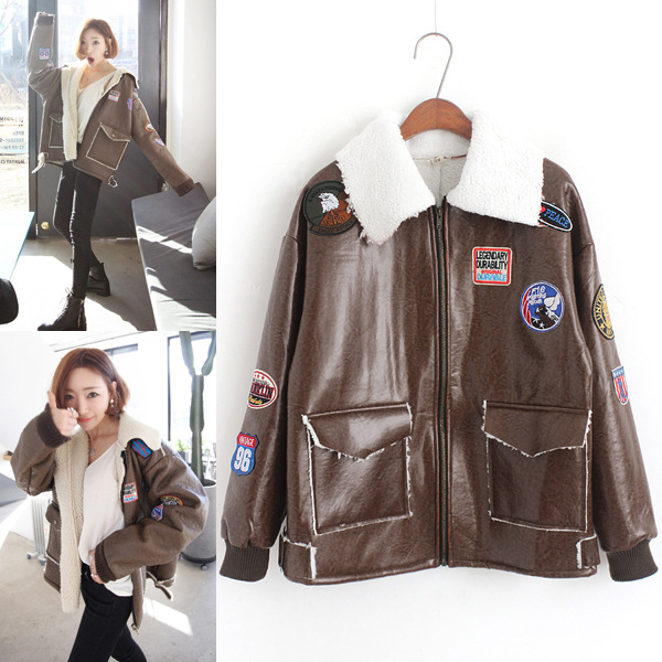 2015韓版 百搭休閑貼標(biāo)加厚保暖羊羔毛皮衣外套 女潮爆 /