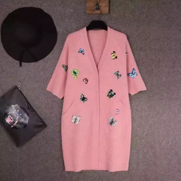 秋冬新款中長款毛衣刺繡蝴蝶釘珠鑲鉆貂絨大衣 女裝大V領(lǐng)開衫外套 /