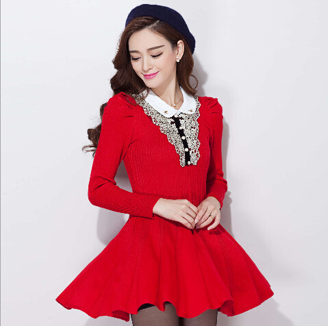 新款秋冬精品女裝韓版中長款花邊領針織毛衣女 針織裙廠家直銷 /