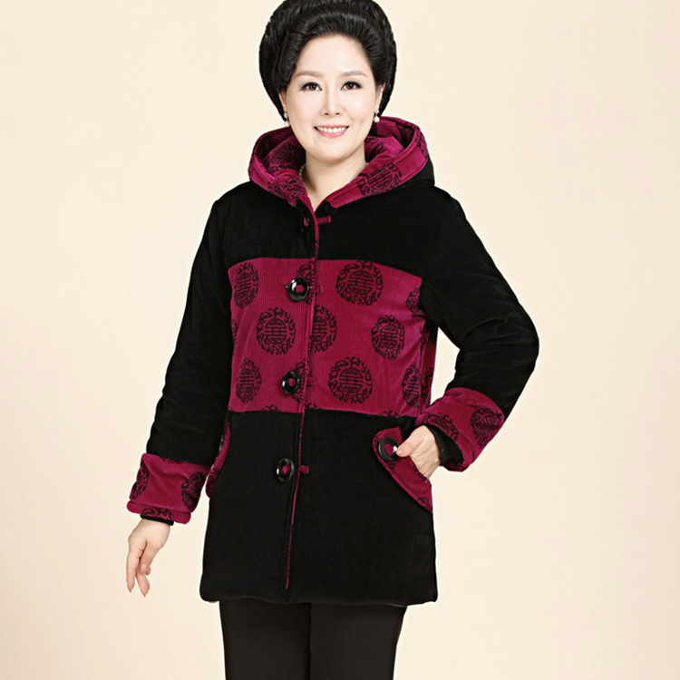 廠家直銷冬季新款中老年女裝棉衣撞色加厚戴帽燈芯絨媽媽休閑棉服 /