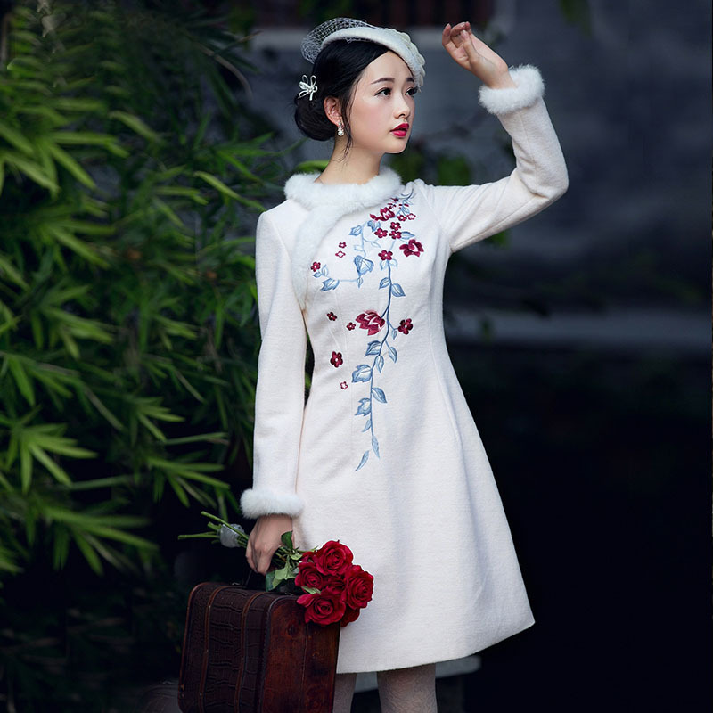 筱姿2015冬裝新款 復(fù)古刺繡羊毛修身加厚中長裙 品牌毛呢連衣裙女 /