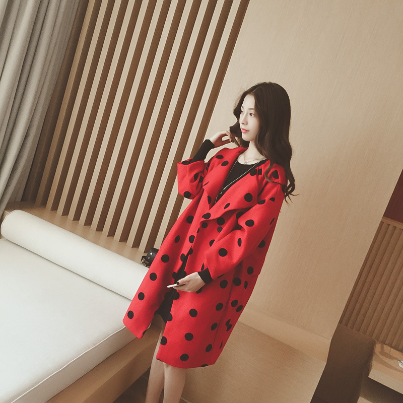 胖MM裝甜美翻領(lǐng)寬松波點呢子大衣中長款大碼長袖暗扣風(fēng)衣外套潮 /