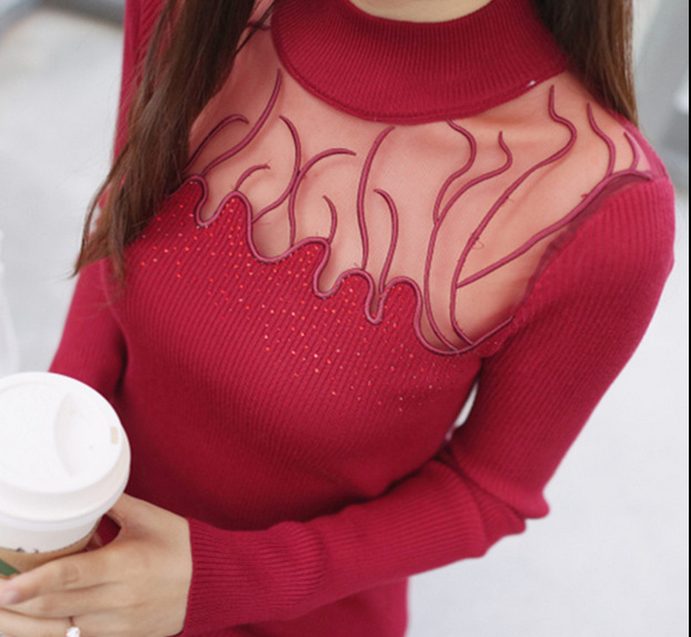 2015秋冬季新款蕾絲長袖套頭修身顯瘦針織衫半高領(lǐng)打底衫女 /