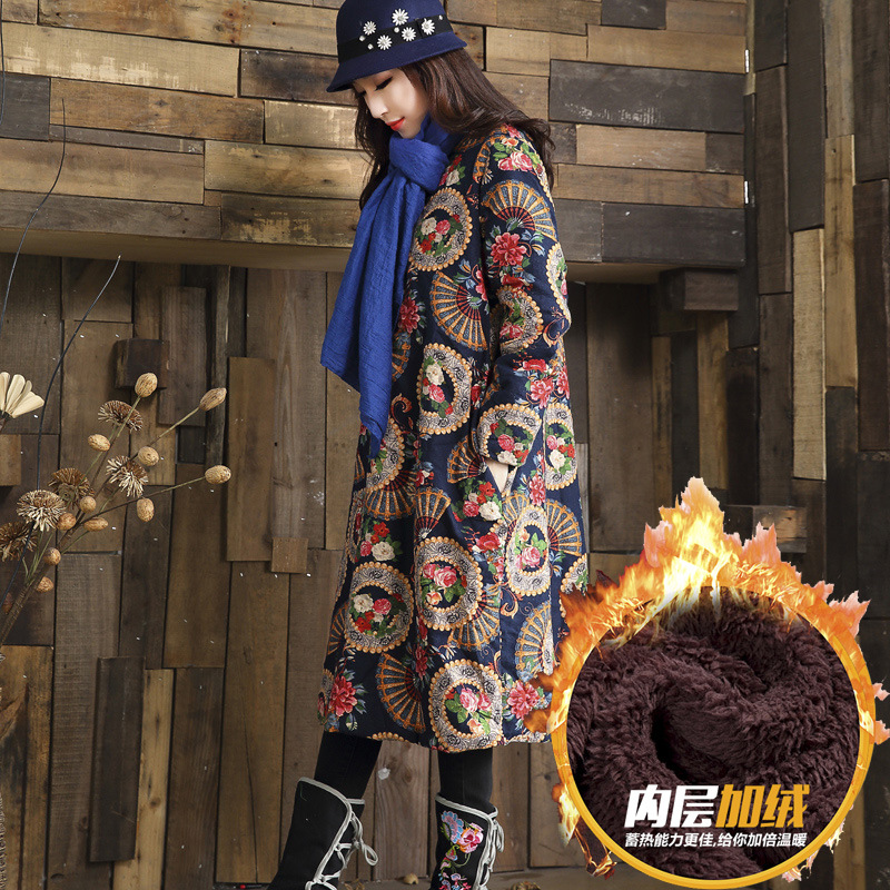 2015冬季新款民族風(fēng)盤扣加長(zhǎng)款棉襖圓領(lǐng)花棉衣外套文藝范棉袍 /