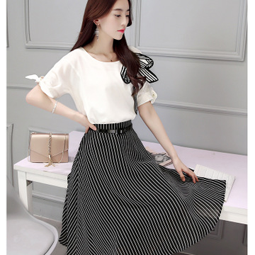 2016夏季學(xué)院風(fēng)修身雪紡長裙套裝裙女條紋裙半身裙兩件套連衣裙潮 /