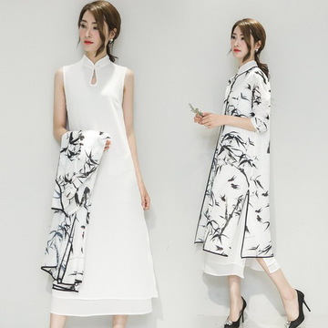 中國風(fēng)旗袍寬松腰水墨印花七分袖兩件套連衣裙2016春夏新款 女 /