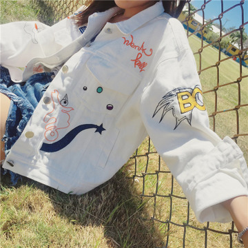 2016學(xué)院刺繡帆布白色牛仔外套女長袖寬松韓版短外套女棒球服 /