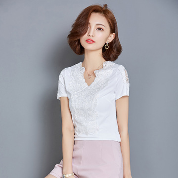 2016夏裝新款純色v領(lǐng)短袖T恤 韓版氣質(zhì)修身蕾絲花邊雪紡上衣女 /