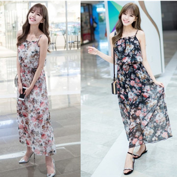 東大門2016夏裝新款波西米亞吊帶長裙女沙灘裙顯瘦碎花雪紡連衣裙 /