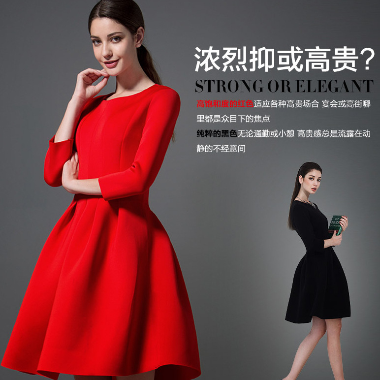 2015秋冬新款太空棉長袖連衣裙蓬蓬裙大碼打底裙氣質(zhì)紅色小禮服裙 /