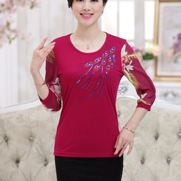 2016春秋新款時(shí)尚媽媽裝中年女雪紡長(zhǎng)袖T恤大碼中老年女裝打底衫 /