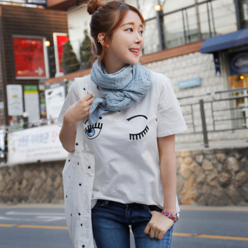Acne潮牌楊冪明星同款夏裝寬松百搭純棉刺繡閃亮大眼睛短袖女t恤 /