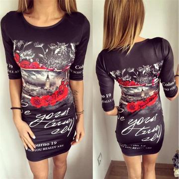 2016歐美爆款裙子速賣通熱銷英文字母花朵印花包臀連衣裙# /