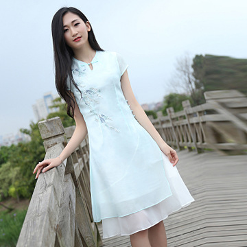 現(xiàn)貨】瓔珞2016春季新款 女裝復(fù)古旗袍式中裙 繡花修身顯瘦連衣裙 /