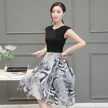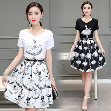 2016夏季新款時尚女裝A字裙半身裙套裝裙兩件套印花短袖連衣裙 /