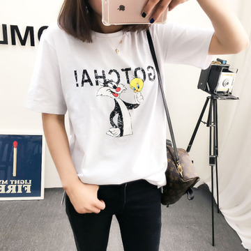 2016新款女裝圓領(lǐng)韓版寬松t恤印花米老鼠短袖純棉T恤棉時(shí)尚打底衫 /