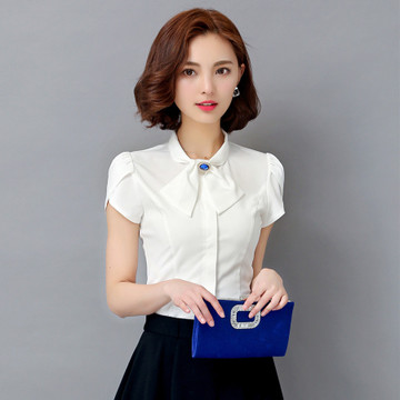 2016春韓范新款蝴蝶結(jié)立領(lǐng)襯衫OL短袖打底衫修身雪紡襯衣女 /
