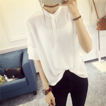 韓國(guó)東大門2016夏裝新款立領(lǐng)百褶袖純色清新甜美顯瘦雪紡衫襯衣女 /