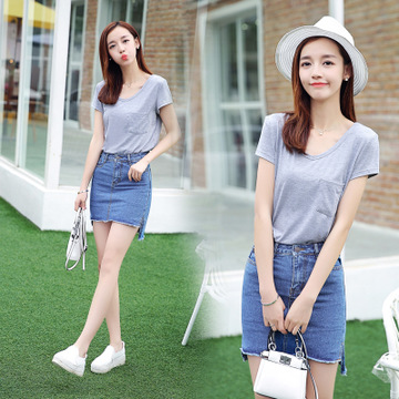 2016春夏新款韓版圓領(lǐng)短袖牛仔半身裙兩件套套裝女 /