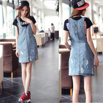 2016韓版學院風磨破百搭牛仔背帶短裙夏小清新修身牛仔連衣裙潮 /