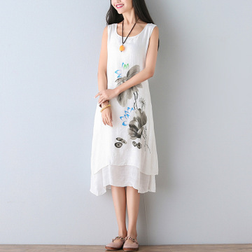 2016夏季新款大碼民族風(fēng)女裝中長款背心裙文藝手繪印花棉麻連衣裙 /