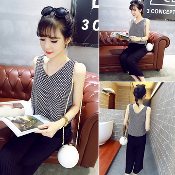 新款韓版時(shí)尚清新小格紋背心上衣+顯瘦百褶褲套裝 /