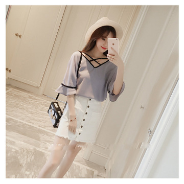 牛仔單排扣半身裙+前交叉雪紡喇叭袖上衣 /