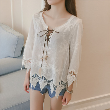 秋裝新款系帶領(lǐng)褶皺蕾絲衫鏤空繡花七分袖T恤 /
