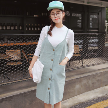 實(shí)拍3306#春季新款韓版學(xué)院風(fēng)單排扣V領(lǐng)吊帶連衣裙中長(zhǎng)裙 /