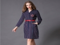 歐洲站現(xiàn)貨實(shí)拍新款時尚歐美V領(lǐng)長袖經(jīng)典條紋修身氣質(zhì)連衣裙外貿(mào) /