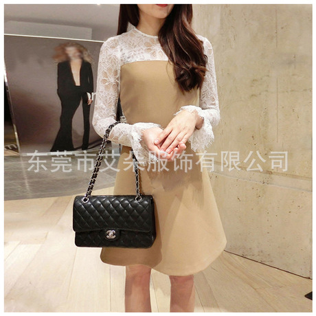 歐洲站法國秋冬新款小清新修身拼色唯美蕾絲連衣裙女 /