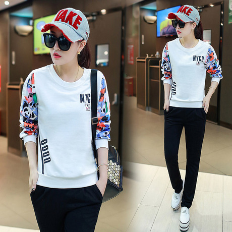 新款女式運(yùn)動(dòng)休閑套裝女裝印花款顯瘦大碼衛(wèi)衣兩件 /