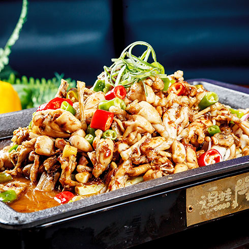 圖上所展示的是愛尚逗蛙炭火牛蛙推出的雙椒炭火牛蛙。冒著熱氣兒的雙椒炭火牛蛙正使出渾身解數勾引著吃貨們的食欲和胃口!夾得時候要小心翼翼,一個激靈就會骨肉分離狀,吃起來口感軟糯綿密,完全入味。紅青椒的微辣搭配紫蘇的風味,很獨特又好吃,秘制了底料,夠辣夠麻夠香。愛尚逗蛙炭火牛蛙歡迎你的加盟。